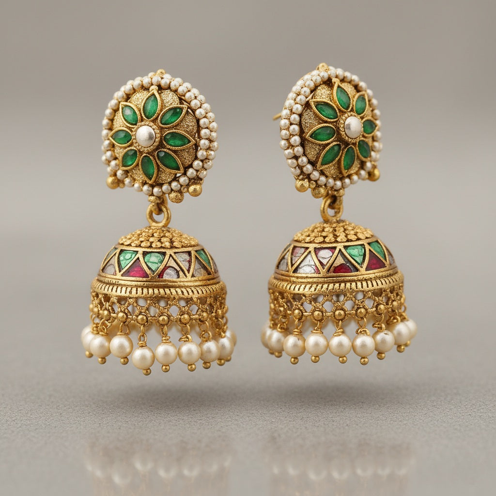 These jhumkas are adorned with delicate pearls and vibrant green stones, making them a perfect statement accessory for any traditional outfit. Light and comfortable, they add sophistication and sparkle to weddings, parties, or festive occasions.