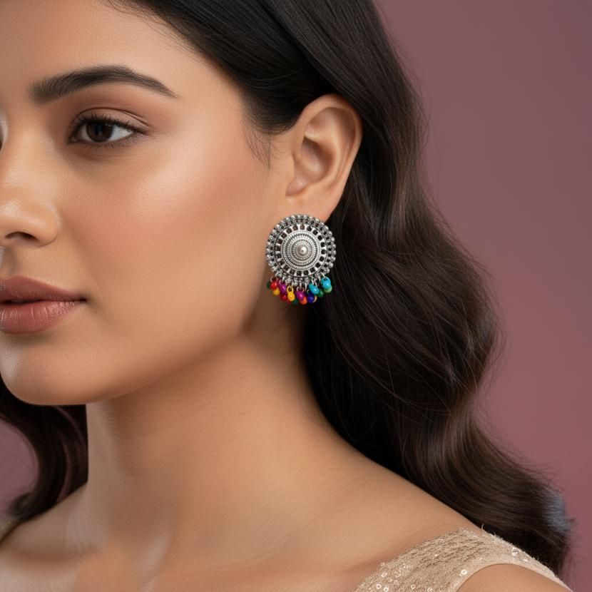 Add timeless ethnic charm to your jewelry collection with this Multicolor Beads Oxidized Necklace Set. Designed in a classic oxidized silver finish, this elegant set features vibrant multicolor bead detailing that enhances both traditional and Indo-western outfits.